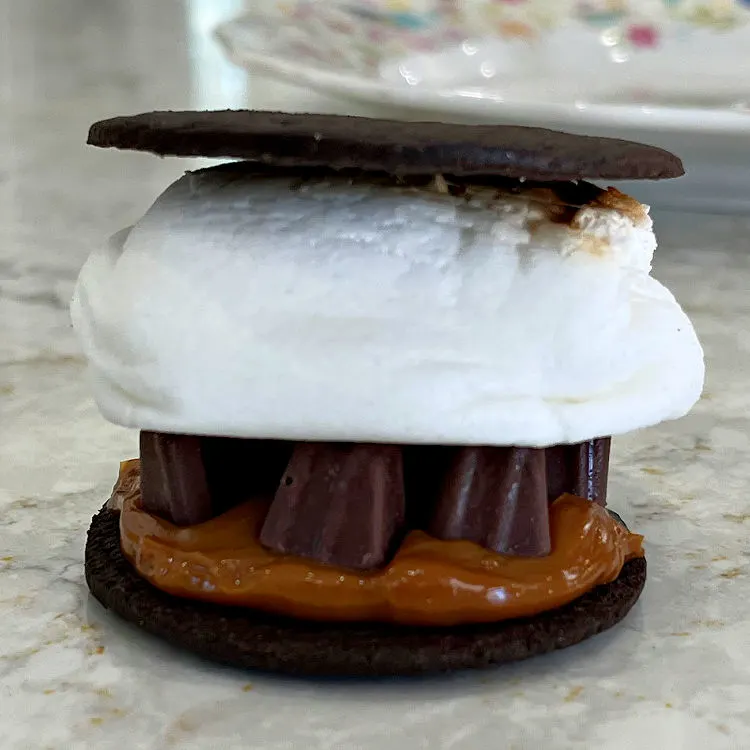 Thin, chocolate-covered pretzels make a yummy Smores with Dulce De Leche and marshmallow.