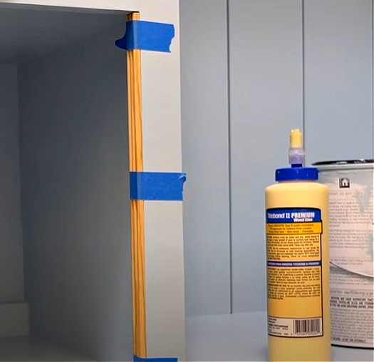 After cutting the trim pieces to size, get a few pieces of painter’s tape ready and apply wood glue to the back of the trim.