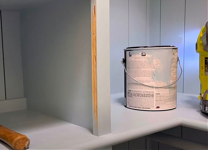 Once your finished hiding the gaps between the trim and plywood, apply 2 or 3 coats of your favorite paint. I used Magnolia Homes by Kilz cabinet & trim paint on my built ins.