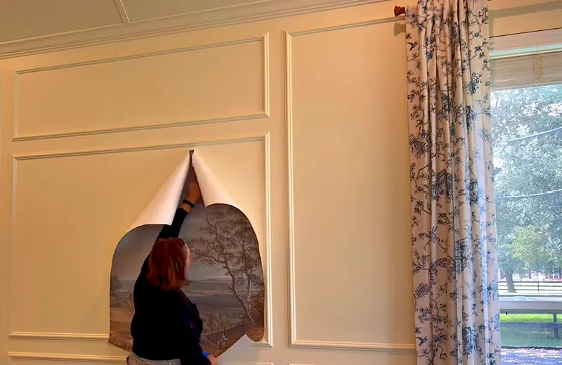 Peeling a small section of the backing on peel and stick wallpaper mural before installing.