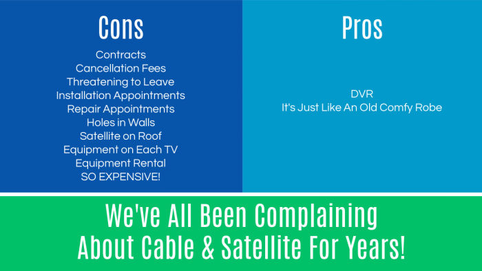 Another negative for cable is having to schedule and wait around for installers or repairmen. No one really wants strangers in their house, right? At least I don’t. You never need an installer for streaming tv.