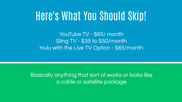 This is really just my personal opinion, but some of these streaming services just seem too much like traditional, expensive cable packages. I wouldn’t use them, just to avoid the big monthly fees.