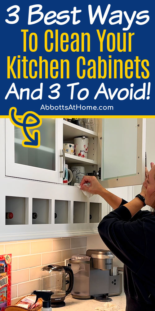 In this post I have 3 SAFE ways to clean kitchen cabinets and 3 common kitchen cabinet cleaners that can actually DAMAGE the finish on your kitchen cabinets. So, be sure to read both.