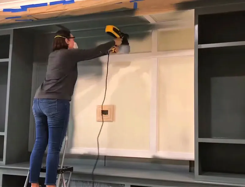 A paint sprayer can absolutely save time when it comes to painting cabinets and built ins. And, by time, I mean hours. I used a paint sprayer on my built ins to apply the first coat of paint and I loved it.