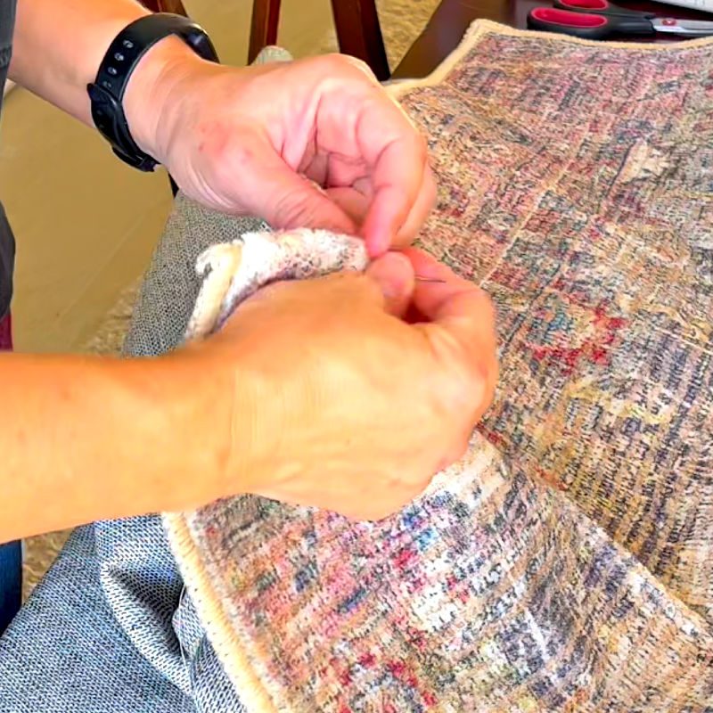 I use a curved upholstery needle and thread to sew under the top and bottom borders on a rug.