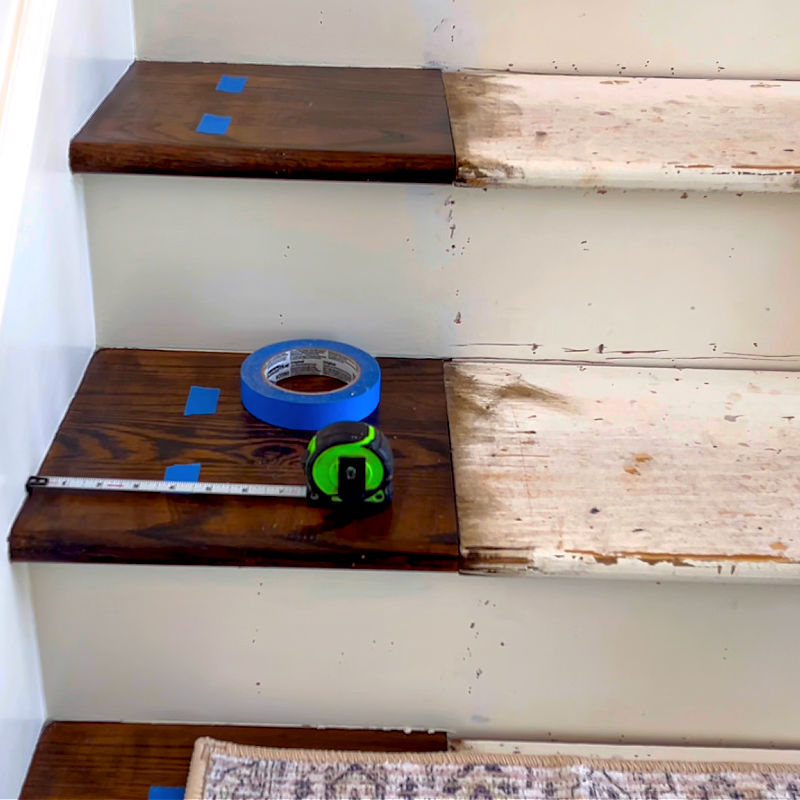 Use a tape measure or ruler to place a little painter’s tape on each step. You only need to place tape on 1 side of the stairs. Then remove the tape when you’re done.