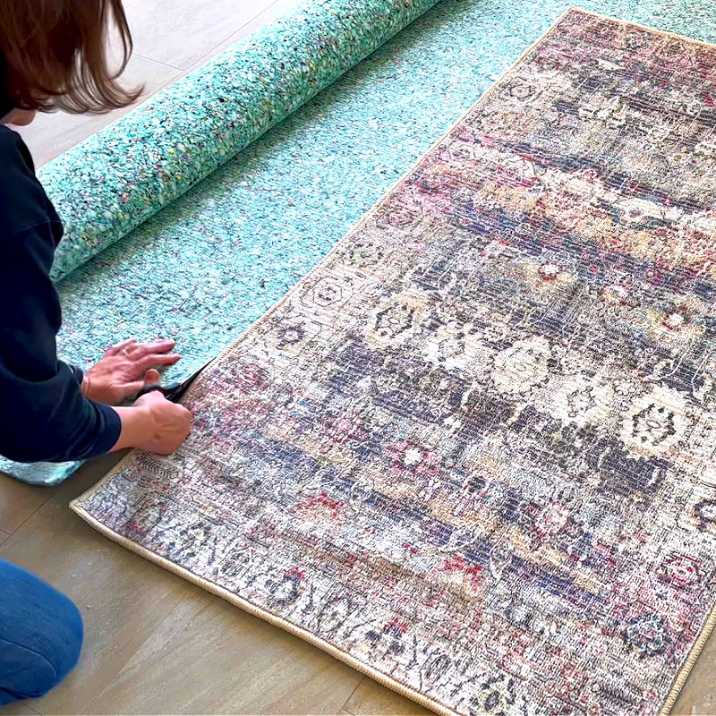 You can use scissors to cut your carpet pad to the right size. The width of the pad should be the width of the rug minus any border.