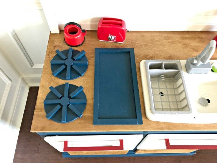 Front view of this DIY Play Kitchen painted red, white, and blue.