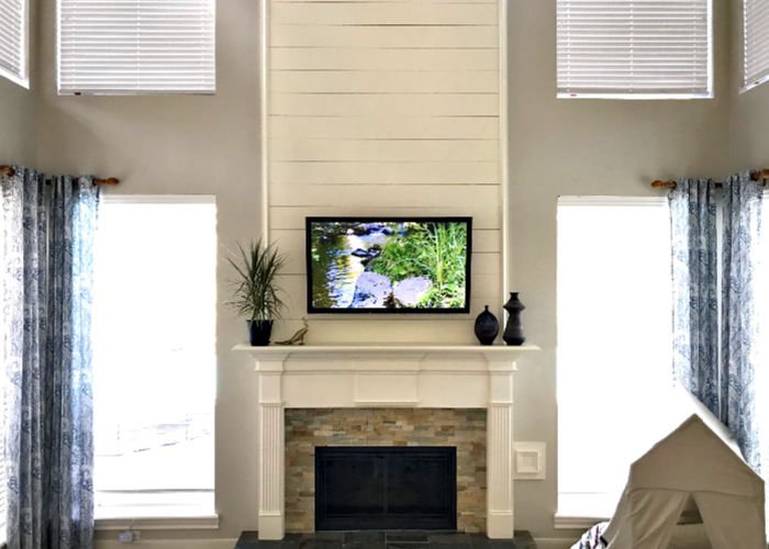 So, in 2018 I hired a crew to come in to install shiplap above the fireplace with power outlets and a tv mount. I’m so glad I made that change.