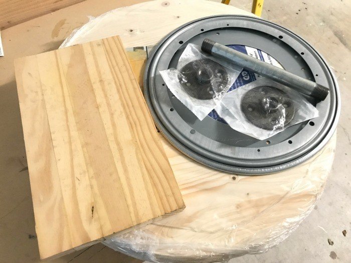 Flip the rounds back over. Center the other flange on the bottom of the wheel and attach with screws. Screw the pipe into the bottom flange. Test that the rounds spins freely on top.