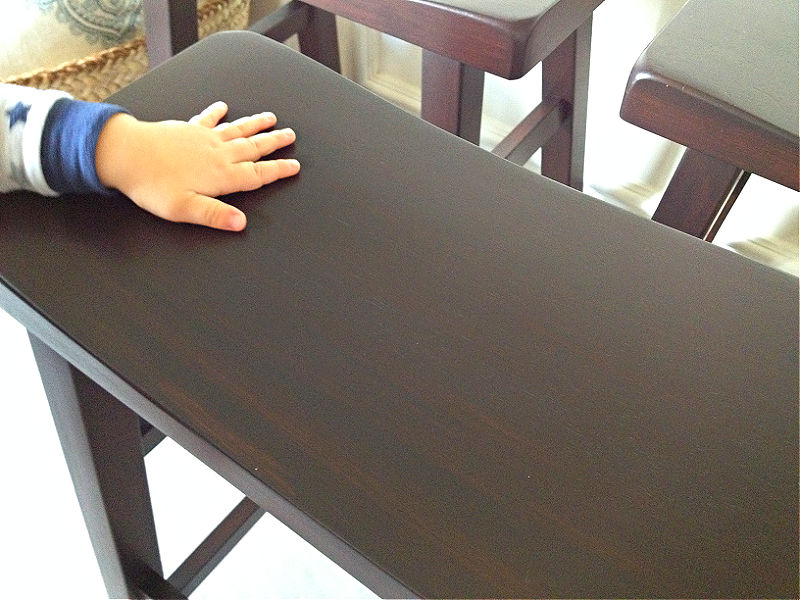 Those stools were a good style, comfy enough and they seemed like they’d hold up to abuse (because you know how 2 little boys are). Luckily, I new a way to make the furniture stain darker without sanding it.