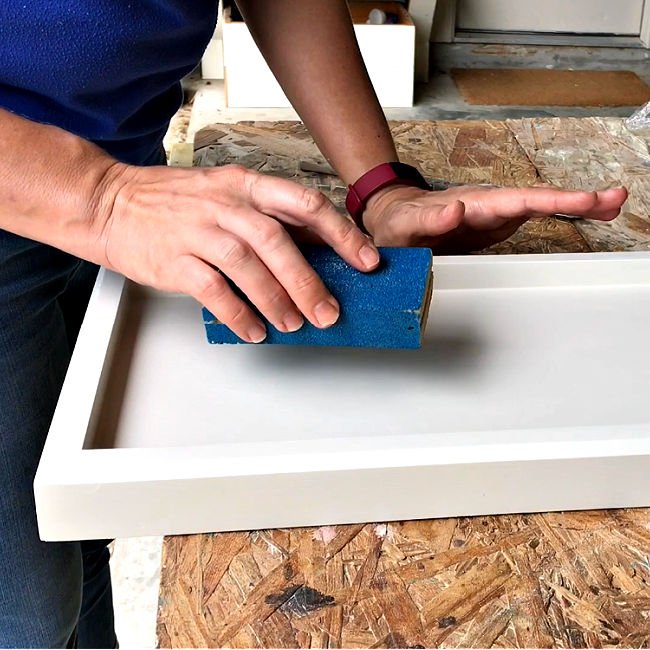 A scuff sanding lightly scratches the old finish so that the new finish has a rough surface to grab onto. After scuff sanding, I wiped off the dust with a very slightly damp cloth. That. is. it. I was ready to stain.