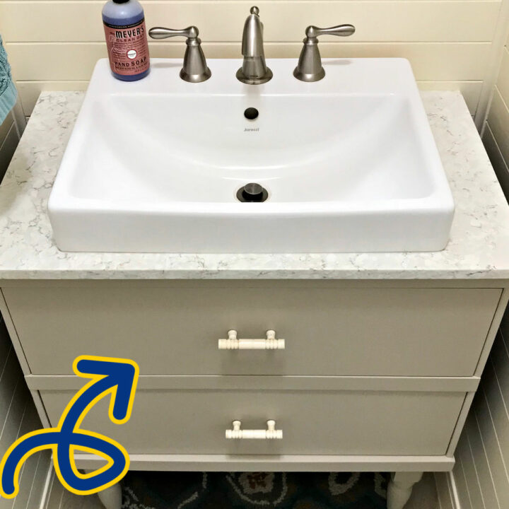 If you’re wondering how to convert that dresser into a vanity, I’ve got tons of tips and steps for How to Cut and Modify Vanity Drawers for Plumbing.