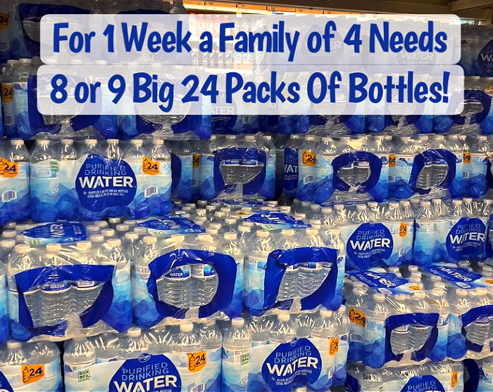 You’d need 8 to 9 large cases of individual water bottles for a family of four. That’s somewhere around 184 individual bottles. There are 4 big negatives with using these for emergency water.