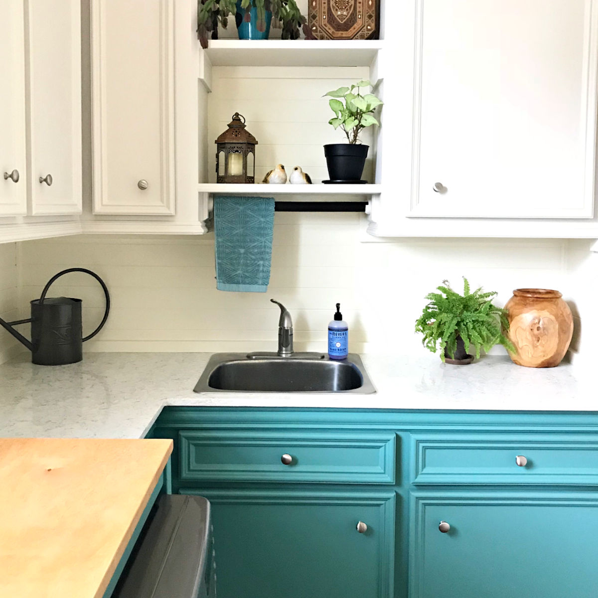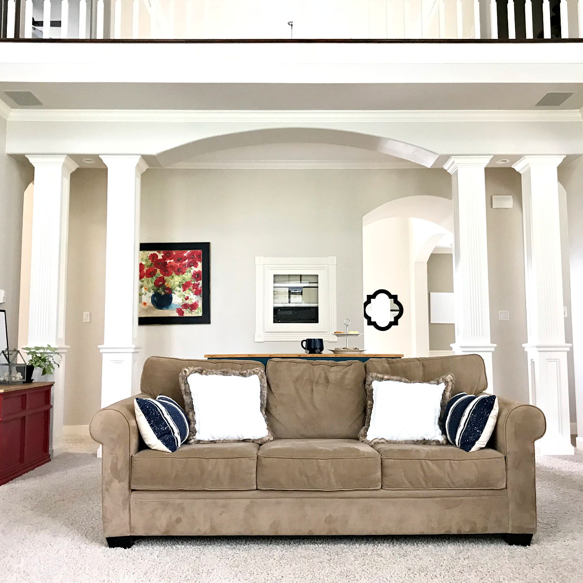 7 before & after examples showing how a Light Paint Color on Walls and Ceilings has made every room feel light, bright, and more open. Walls and upper cabinets painted in Behr's Sandstone Cove in Eggshell Sheen. White Trim Painted with Behr's Polished Pearl in Eggshell Sheen.