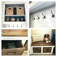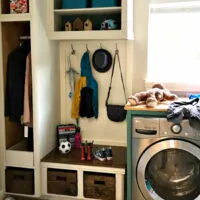 How I Added a Mudroom in a Small Laundry Room with cheap DIY projects and ideas that turned cabinets into a bench, shoe and coat storage.