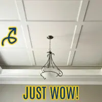 I LOVE this beautiful DIY coffered ceiling design. Steps, photos, and how-to video for this EASY flat coffered design using 1×4’s & cove.