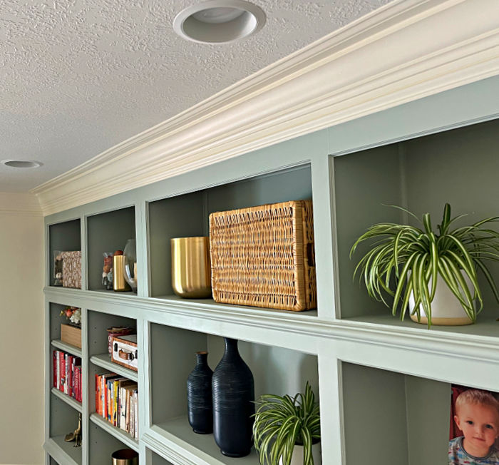 After the caulk has dried, you’re ready to paint! I used Eggshell Sheen on the trim, walls, and ceiling in this room. You can see more examples of Eggshell Sheen on my ceilings in a previous post.