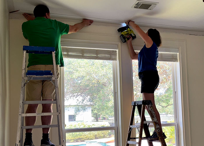 I used 1 1/4″ brad nails to install all 3 pieces of this crown molding look. I recommend slightly angling your Brad Nailer so that the nails go in at a slight angle.