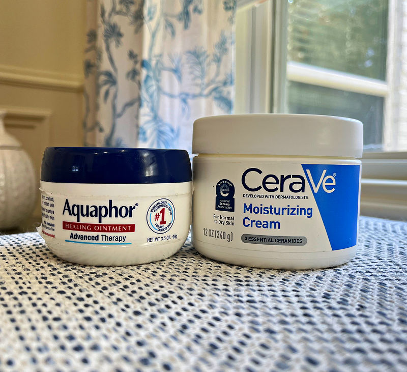 So, I use Eucerin Advanced Repair Lotion or Vaseline Advanced Repair Lotion on my whole body right after showering and towel drying. Then I put the Aquaphor or Vaseline over that on my hands and feet before getting dressed.