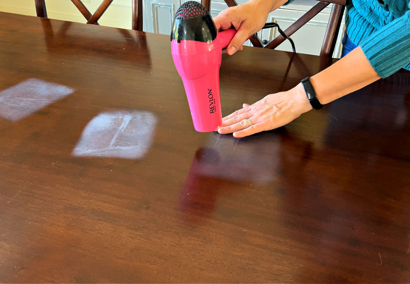 Sometimes a blow dryer can remove heat stains. Before trying, be sure to follow the safety tips to check the finish on the table and avoid overheating the area.