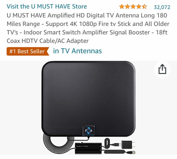 To get your FREE local TV channels at home, you’ll need an antenna for each TV you want them on. I have this affordable antenna. To use it, plug it into a power outlet and the antenna outlet on your TV.