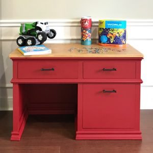 After the table top is glued, you can ligthly sand the corners, if you’d like. Then clean off and touch up the paint. Let that dry. Then apply your favorite water-based polycrylic. 🙂